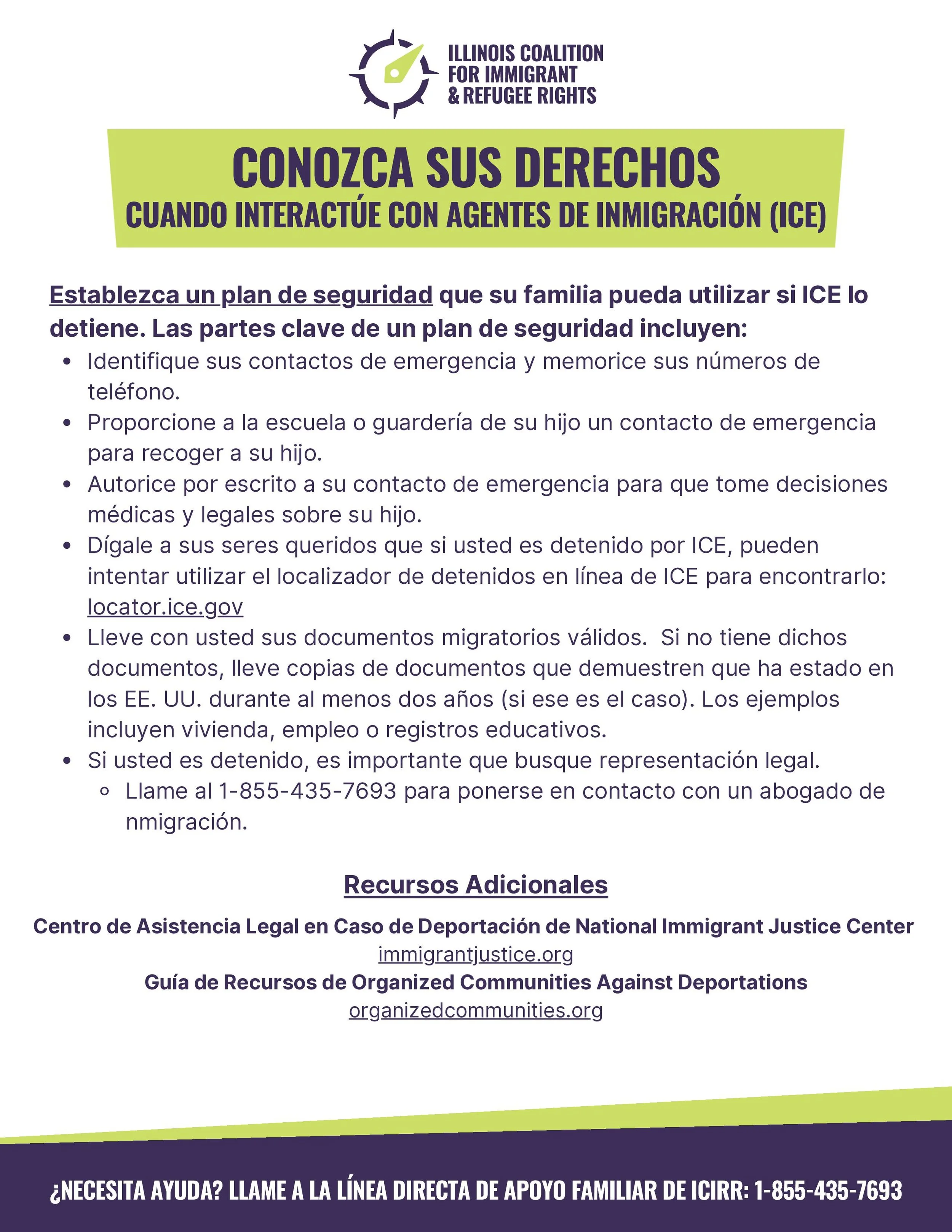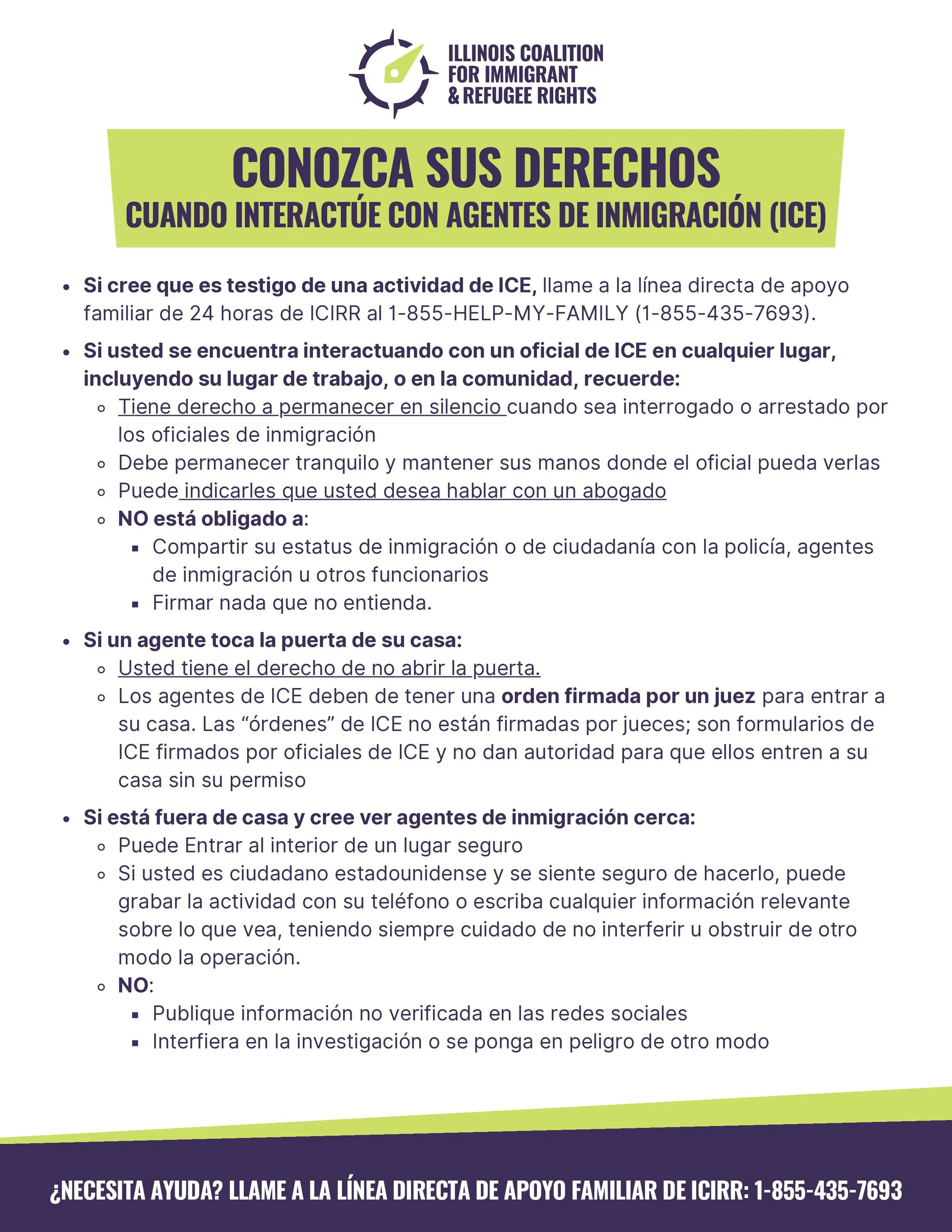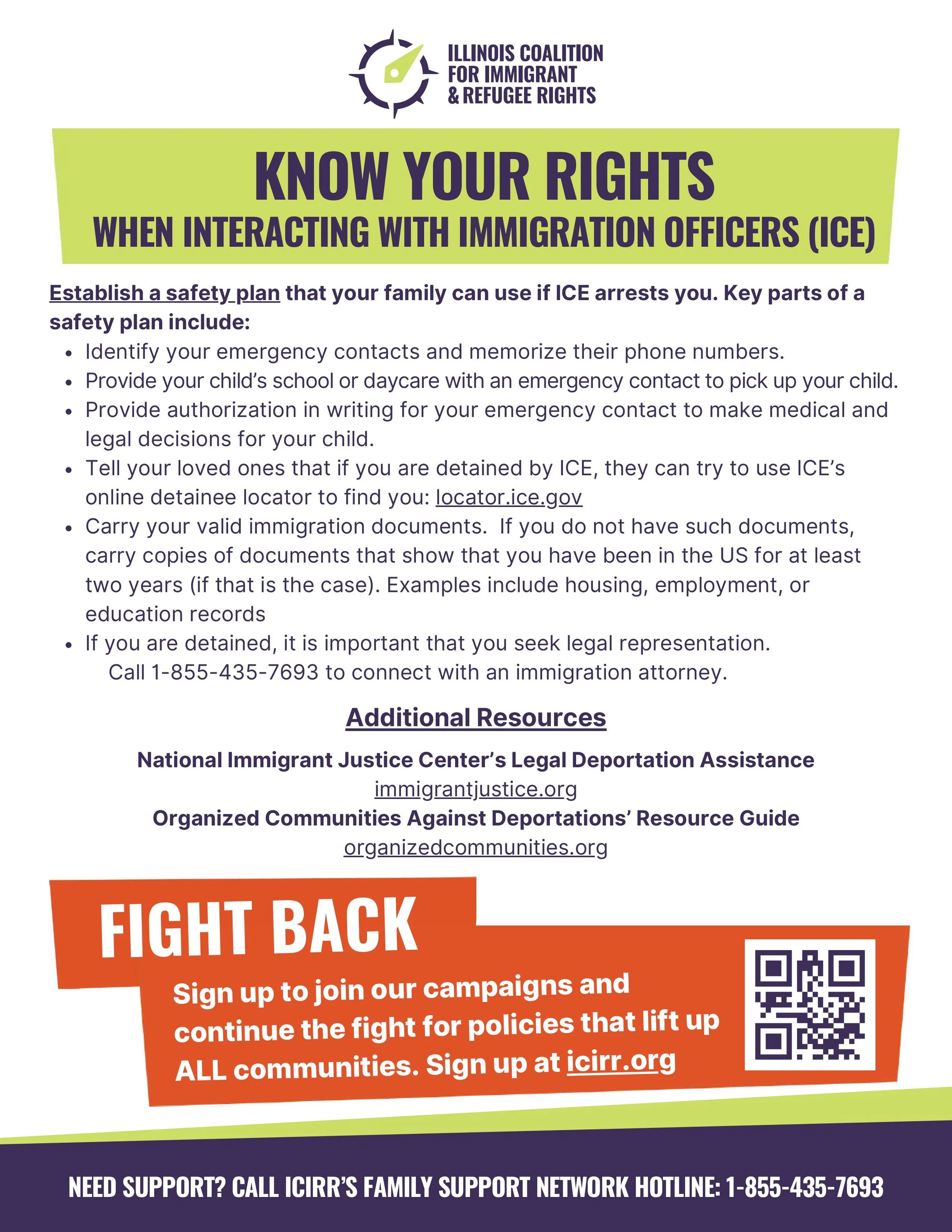 The ICIRR Family Support Network Hotline (FSN) can connect immigrant families to social services, legal aid, financial assistance, and more. It can also be used to report ICE activity and can support locating someone in ICE custody. The FSN can be reached at: 1-855-435-7693